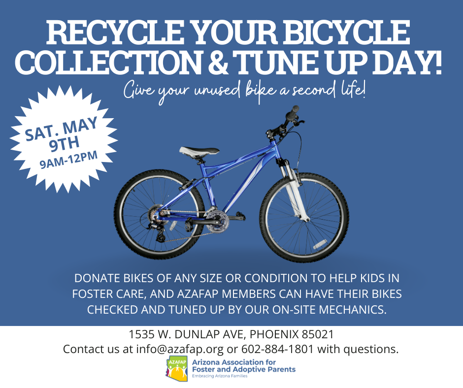 Recycle Your Bicycle (RYB) invites the community to participate in our Bike Collection Day. We are accepting adult and youth bikes in any condition. Donated bikes will be refurbished and provided to children and youth in foster care, helping promote independence, confidence, and healthy activity. Your donation makes a meaningful impact—thank you for supporting foster families and youth in our community.